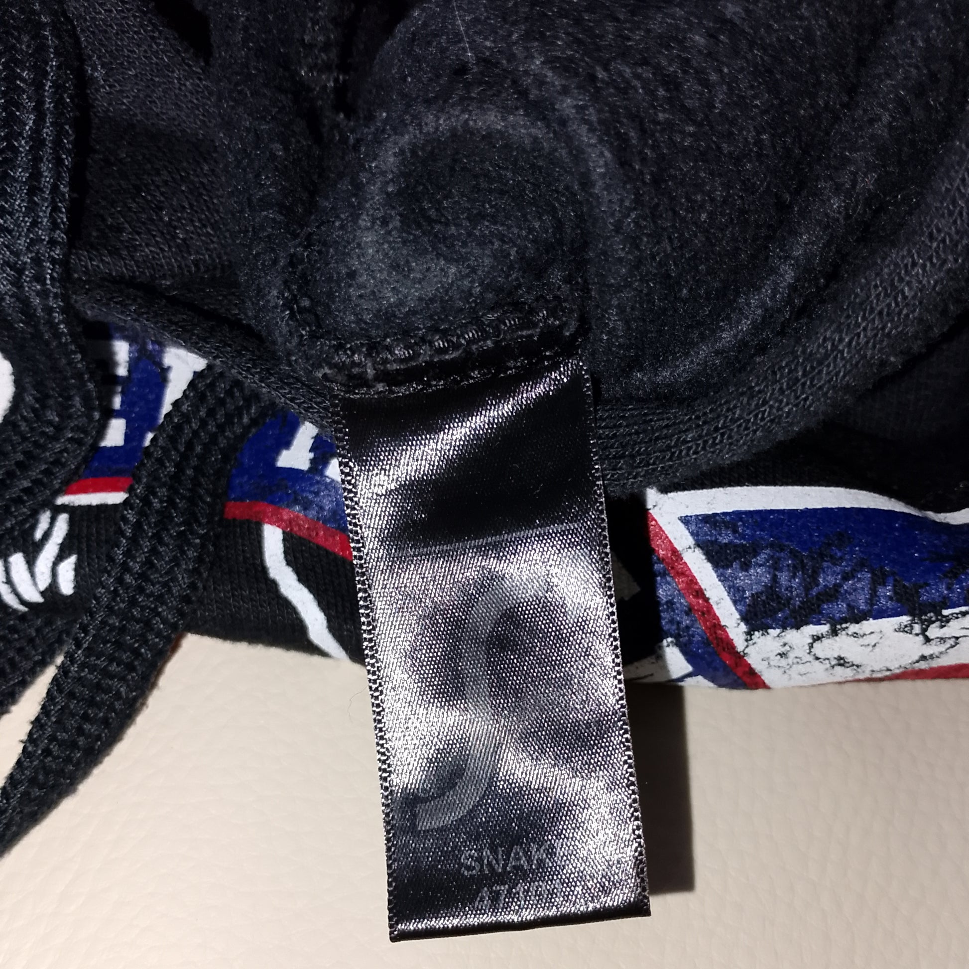 Colore base nero con stampa in blu, bianco e rosso.