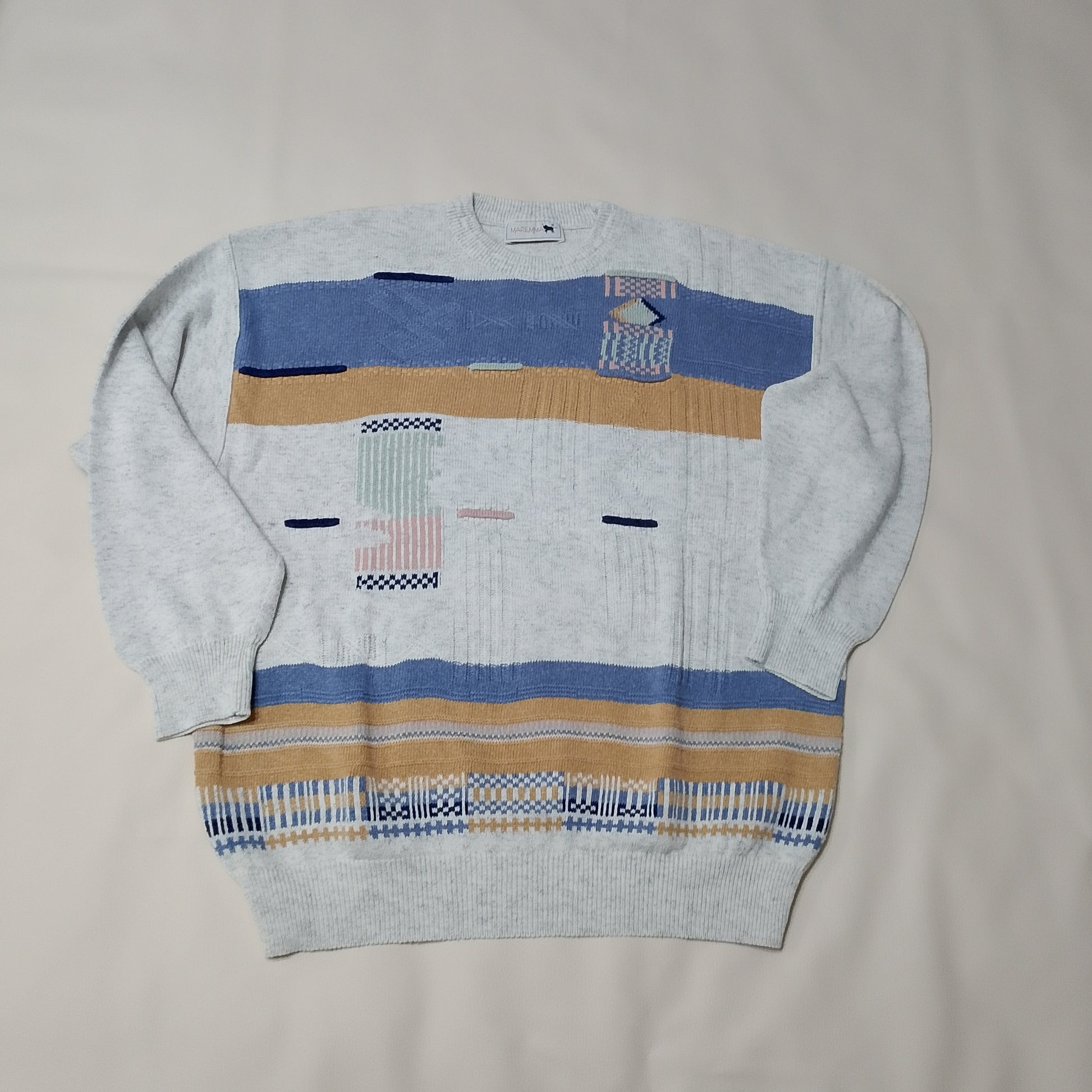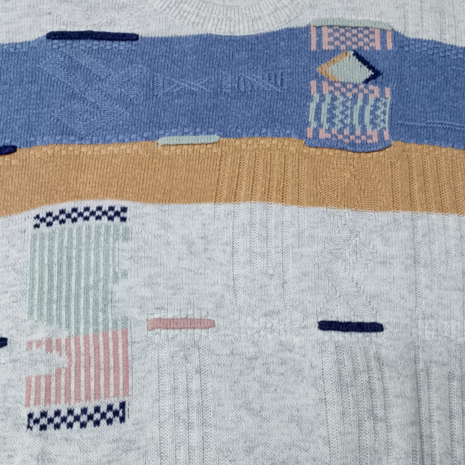 Colore bianco con sfumature di grigio, motivi blu chiaro, crema, verdino.